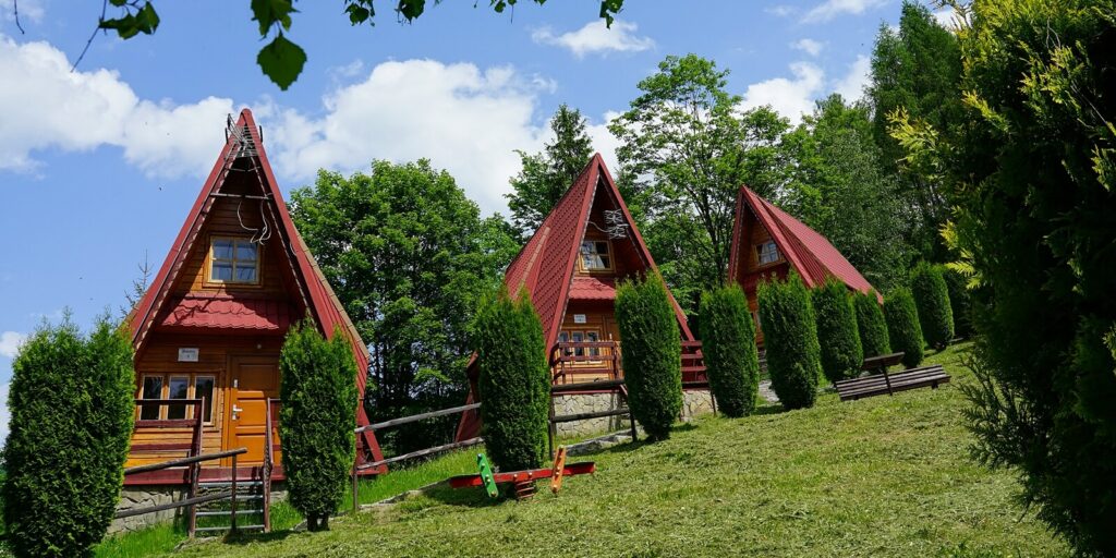Nasze czteroosobowe chatki to całoroczne domki w standardzie domku letniskowego, w kształcie litery A, idealny na wypoczynek przez cały rok. Obiekt zapewnia standard turystyczny i jest ogrzewany elektrycznie, co gwarantuje komfort w każdej porze roku. To doskonała opcja dla rodzin lub grup przyjaciół szukających wygodnego i funkcjonalnego miejsca na nocleg w malowniczej okolicy.